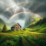 "La imagen muestra un campo verde donde se encuentra una pequeña casa de madera, con un arco iris perfecto y brillante descendiendo hasta el suelo, creando una escena de naturaleza y tranquilidad pintoresca y serena."